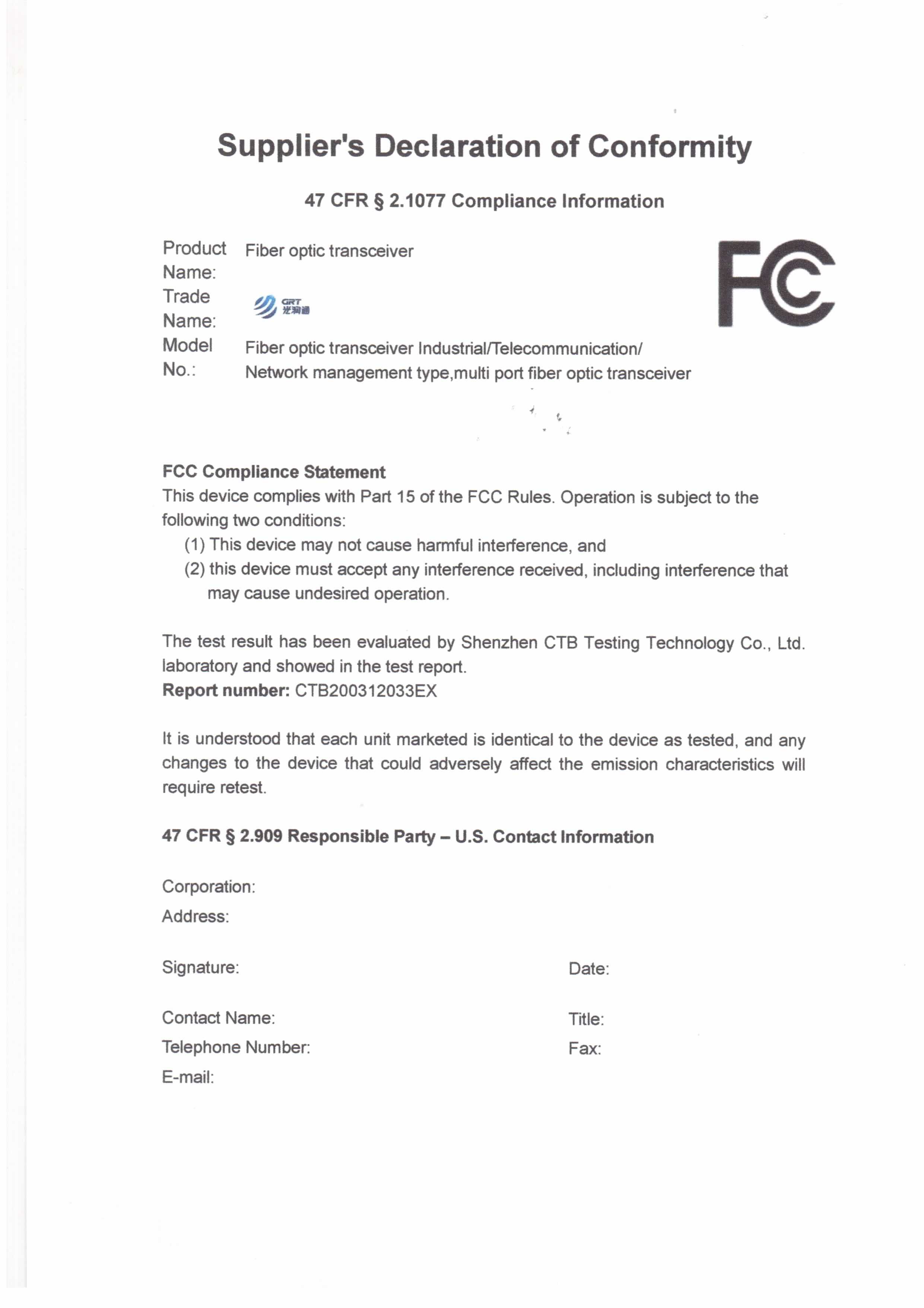 光潤通已通過FCC認證。 FCC許可證是美國市場上電子產品上使用的認證標志,證明電磁干擾低于美國聯邦通信委員會的限制標準。 光潤通產品完全符合FCC標準,確保產品安全性。