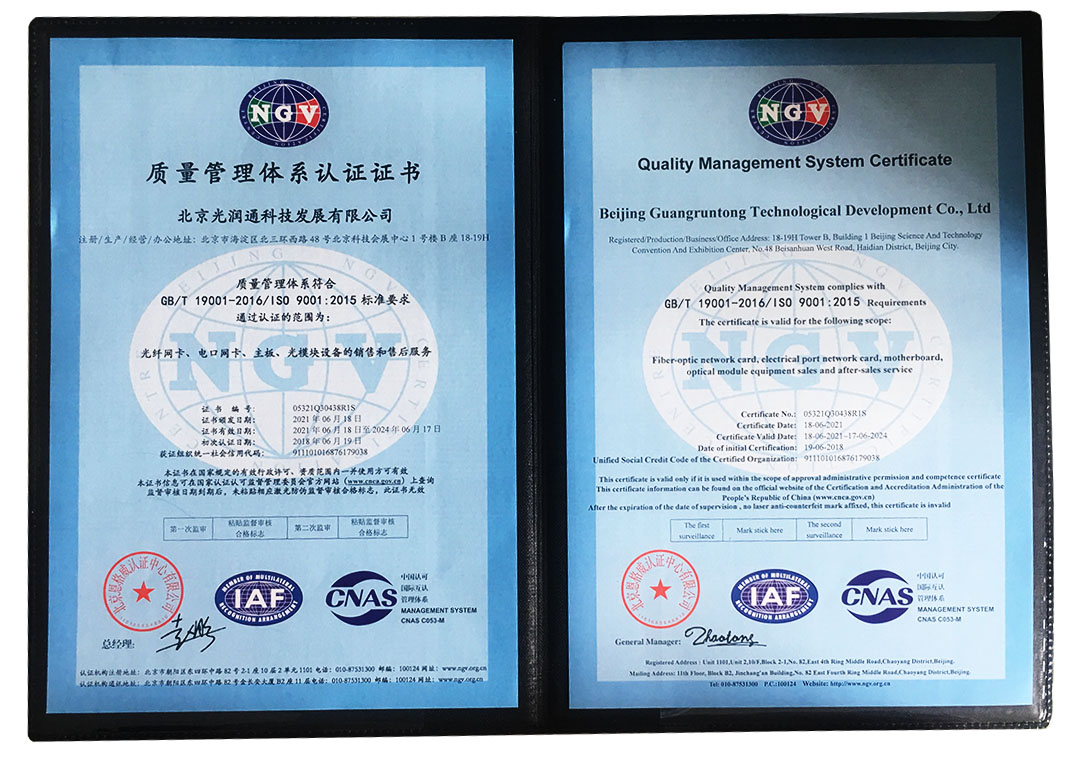 光潤通已通過ISO 9001認證。國際標準化組織(ISO)對控制每個產品過程及持續的質量改進提出了具體化流程要求,證實了光潤通具有提供滿足顧客要求和適用法規要求的產品和能力。